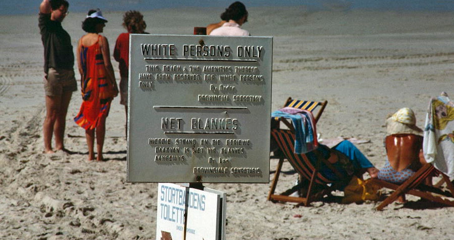 South Africa’s apartheid policy gave many legal and social privileges to the largely Dutch-descended white population. Literally meaning “separateness”, Black people1 had to live in specific townships and carry pass books to enter White areas. Mixed marriages and interracial relationships were illegal. Schools, sports, hospitals, beaches, trains, and buses were segregated. Black residents were expected to step off the pavement when Whites walked towards them, and were subject to harassment, unprovoked arrest, and nightly curfews.
